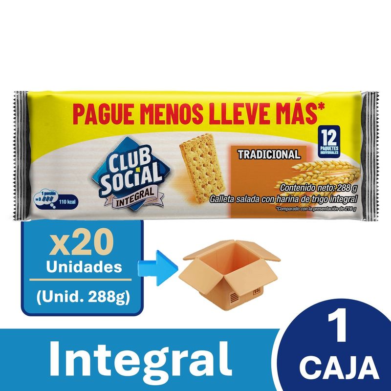 Galletas Saladas Club Social Integral con Harina de Trigo Integral. Contiene 12 paquetes de 24 grs c/u